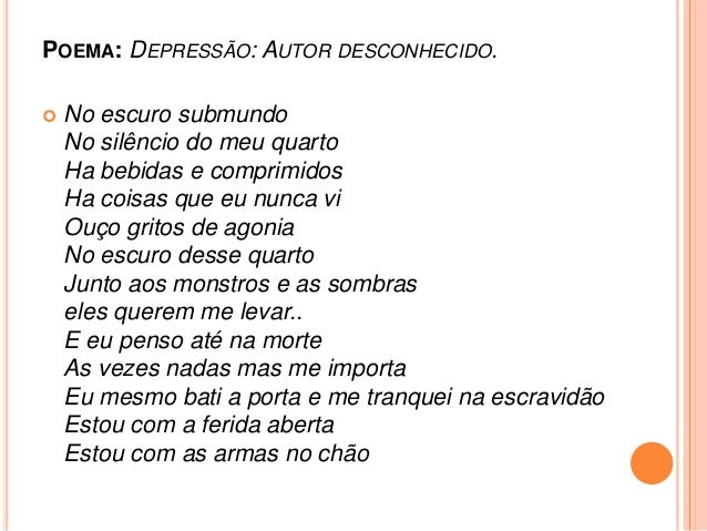 Depressão com Poesia Reflexões sobre o voo from depressaocompoesia.com Depressão é coisa muito séria, contínua e complexa. Depressão porque depressão?não deixe ela ficarela chega de vagar querendo um lugartira a paz da almatira a alegria de vivera depressão é tão terrívelque te leva a sofrer.vem com uma tristezaque não quer passardepois uma incertezaque te faz chorar.tudo fica triste ao redoralegria não existeapenas a tristeza insiste.chame deus dono de tudopra socorrer seu coraçãoparentes e amigos. About press copyright contact us creators advertise developers terms privacy policy & safety how youtube works test new features press copyright contact us creators.