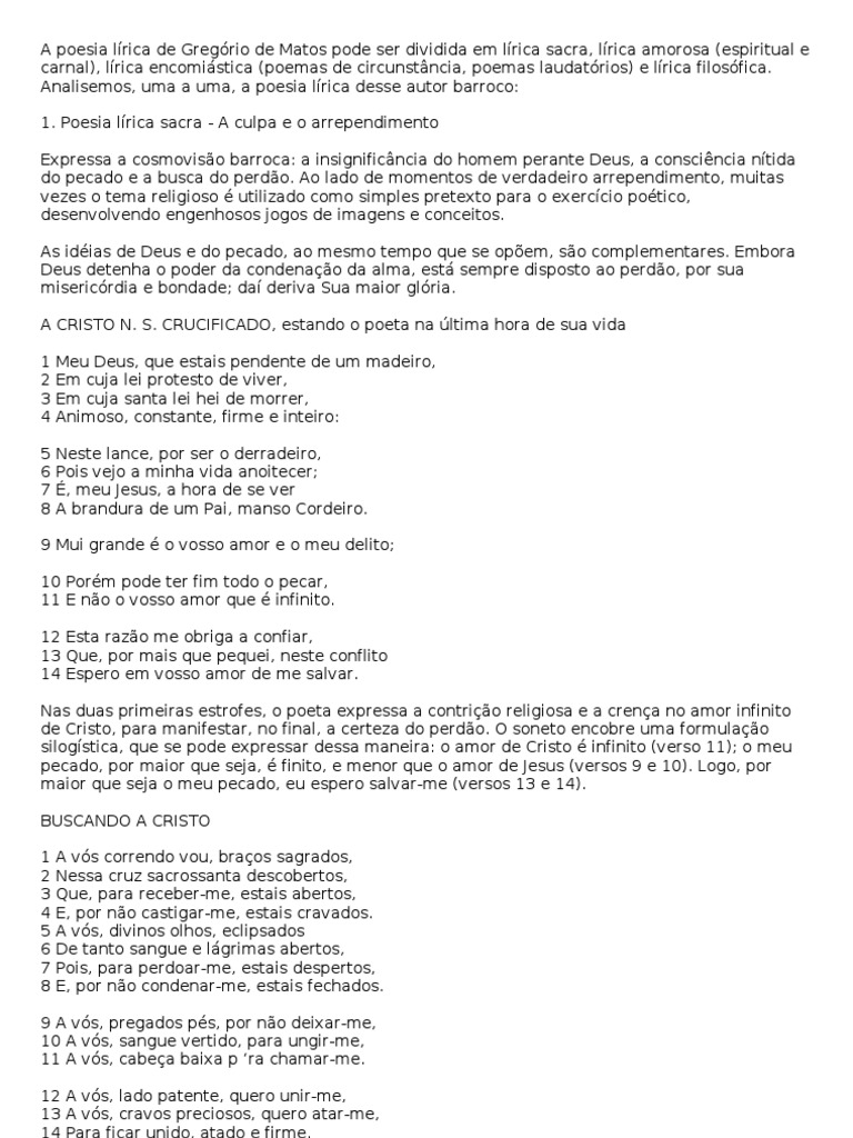Poemas líricos de gregório de matos guerra barroco no brasil 1. Sua lírica amorosa é farta e mostra pérolas raras, como os poemas a dona ângela ou a maria dos povos. Religiosa, lírica e satírica de gregório de matos guerra. Qual a temática predominante na lírica amorosa de gregório de matos?